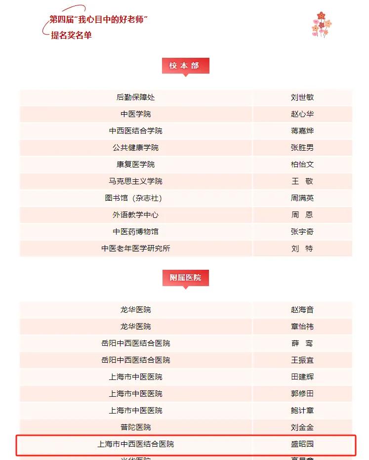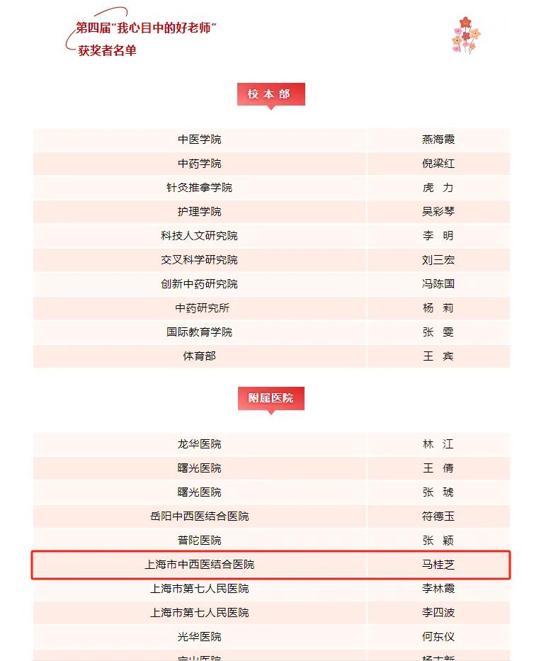 今年是第40个教师节,为不断深化教师思想政治和师德师风建设,选树宣传先进典型,上海中医药大学开展了第四届“我心目中的好老师”评选活动。我院针灸科副主任马桂芝荣获第四届“我心目中的好老师”,传统医学科主任盛昭园获得第四届“我心目中的好老师”提名奖。