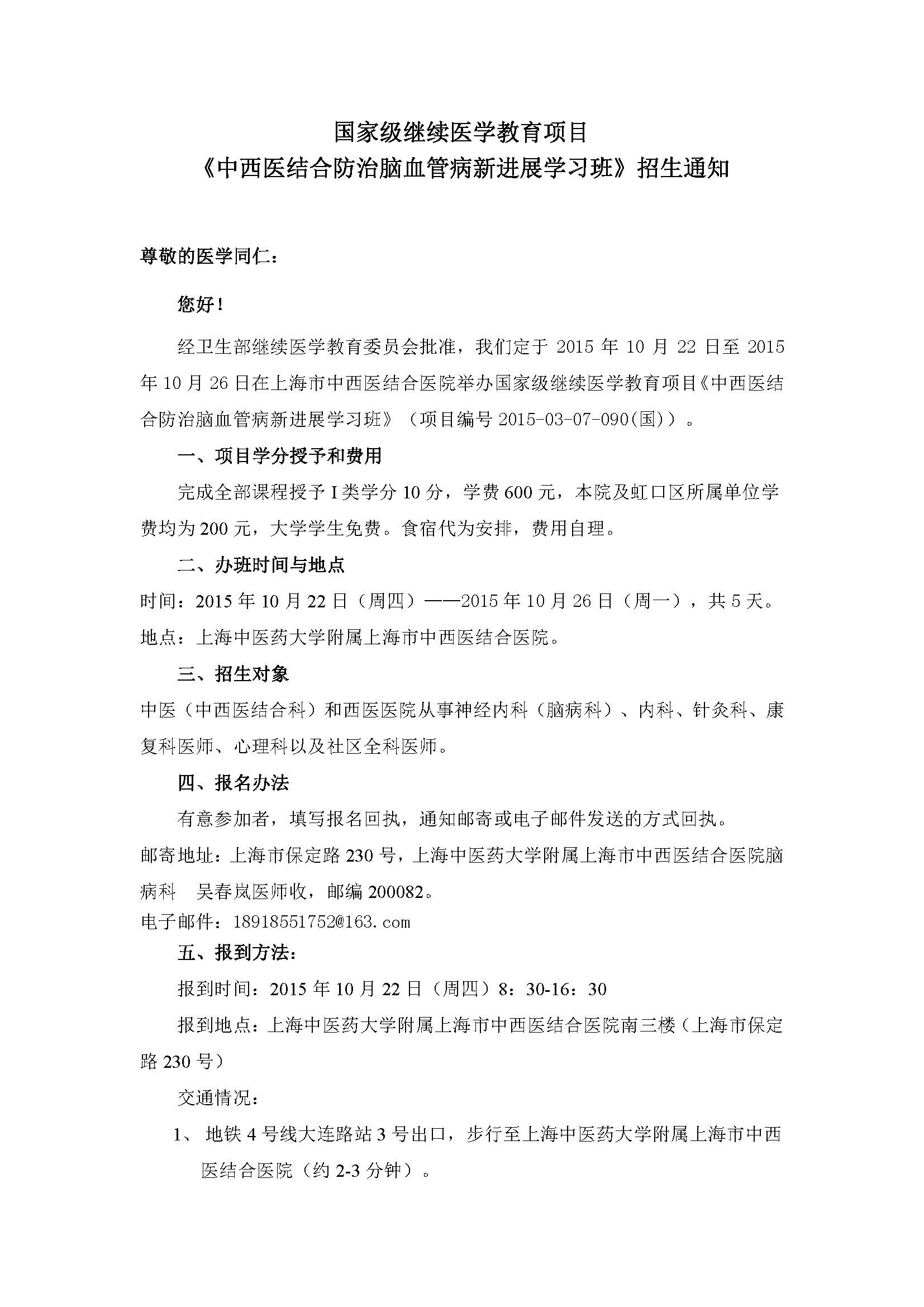 国家级继续医学教育项目《中西医结合防治脑血管病新进展学习班》招生通知