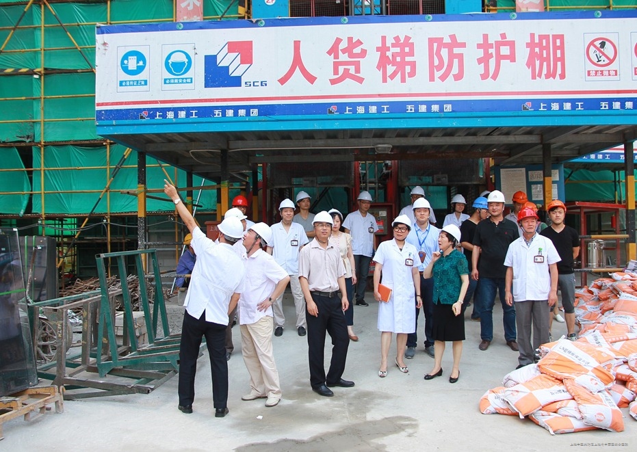 为进一步推动我院中医特色大楼建设进展,8月2日下午,区卫计委党工委书记郭海英、主任张伟胜、副主任苏平、医管科科长史立华,在我院院长舒志军、党委副书记周铭、副院长谢春毅、金琳及相关部门负责人的陪同下来到中医特色大楼施工工地,详细询问施工进展情况,并现场察看病房样板间等工程现场。