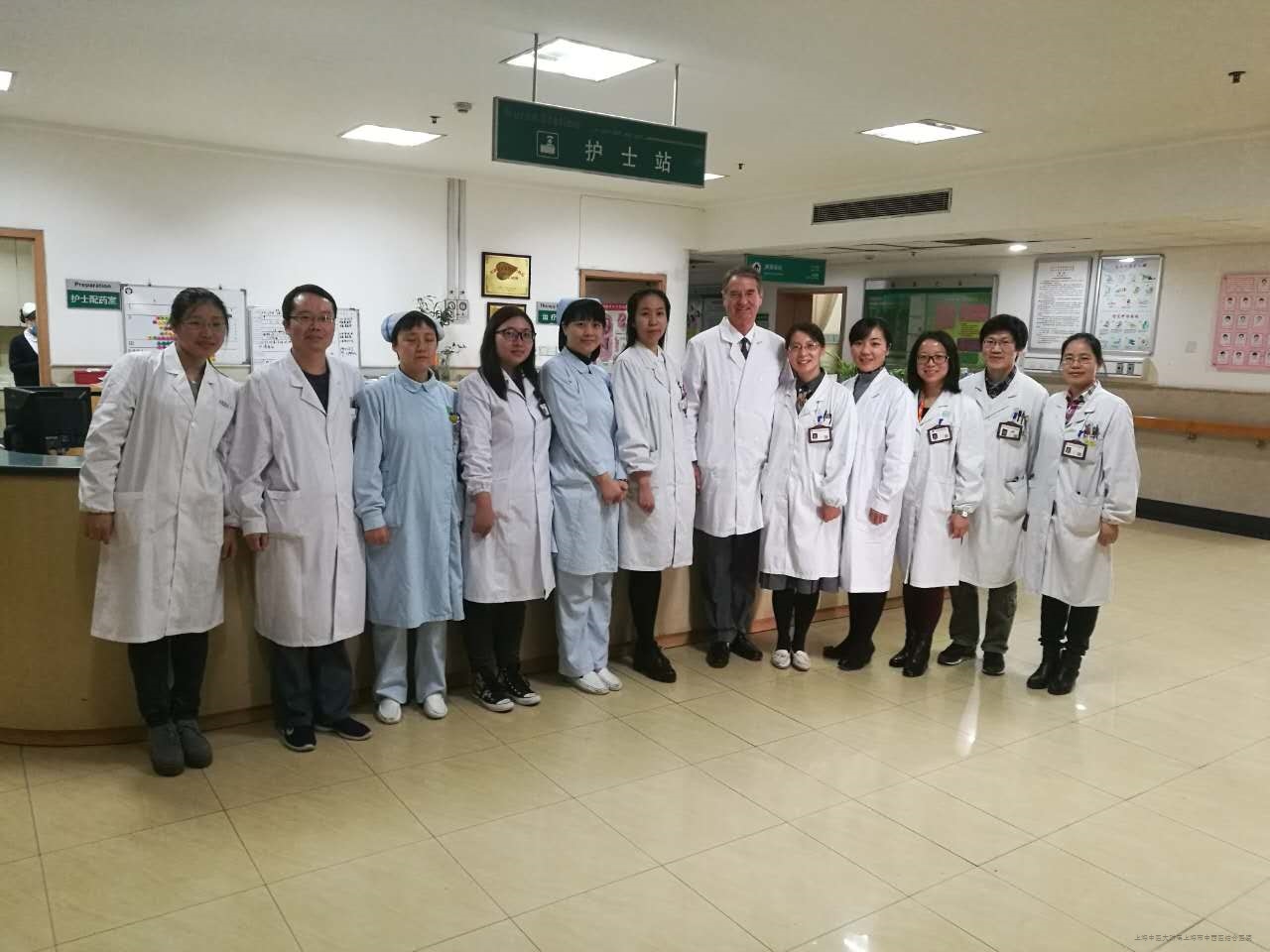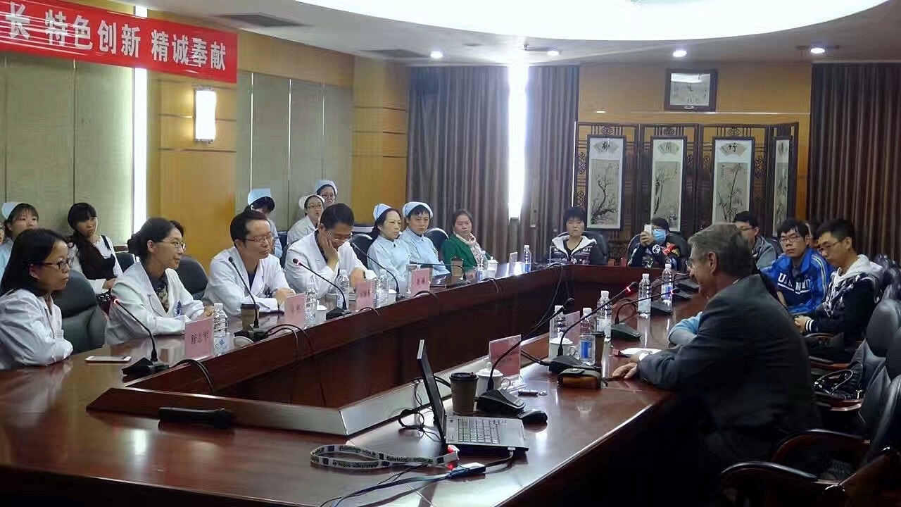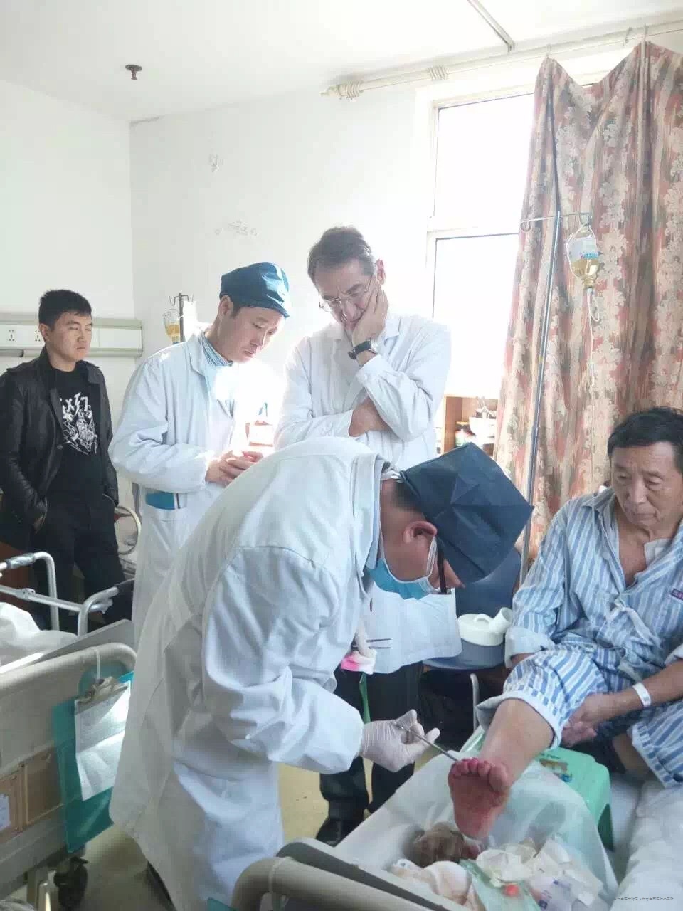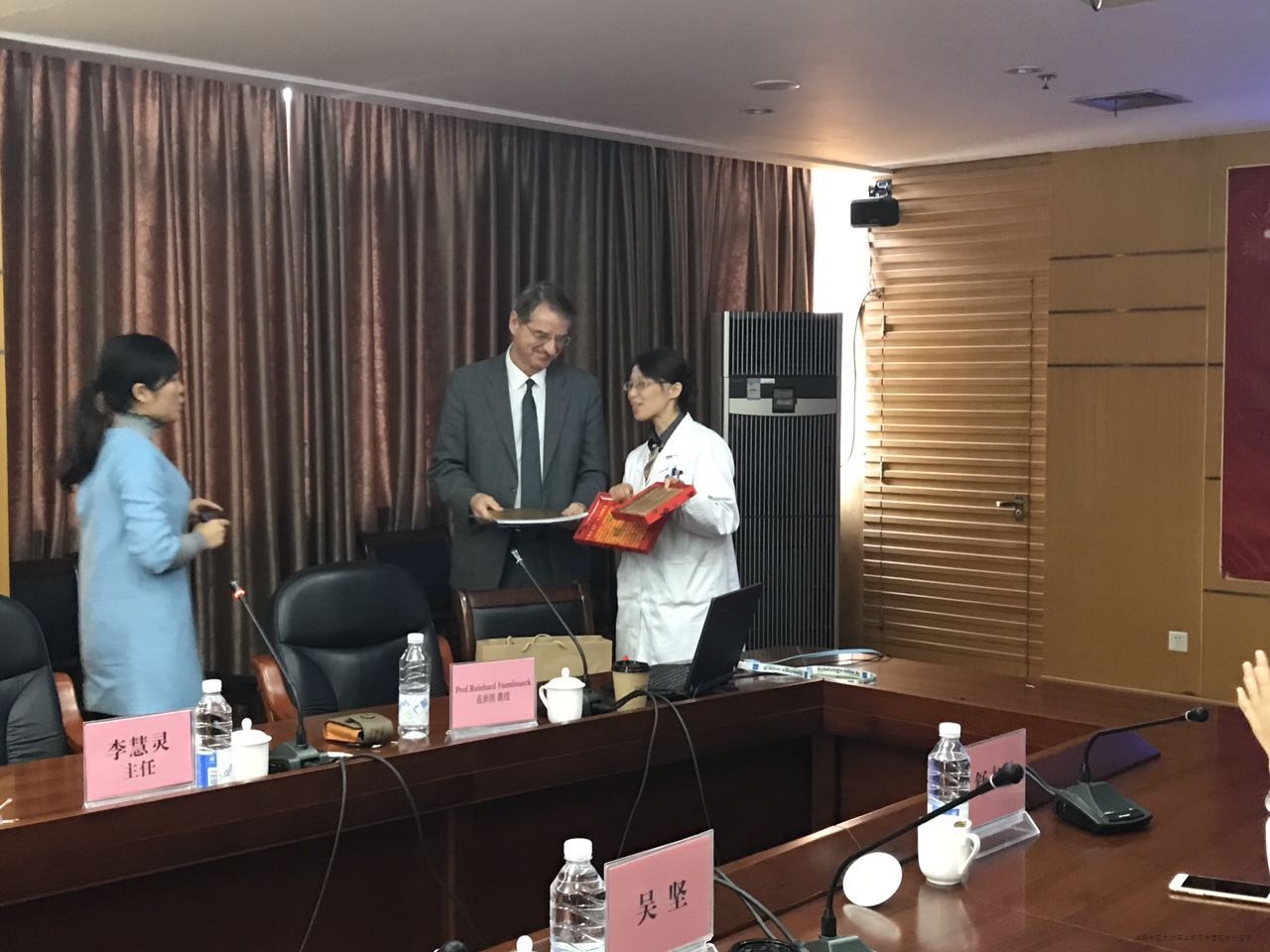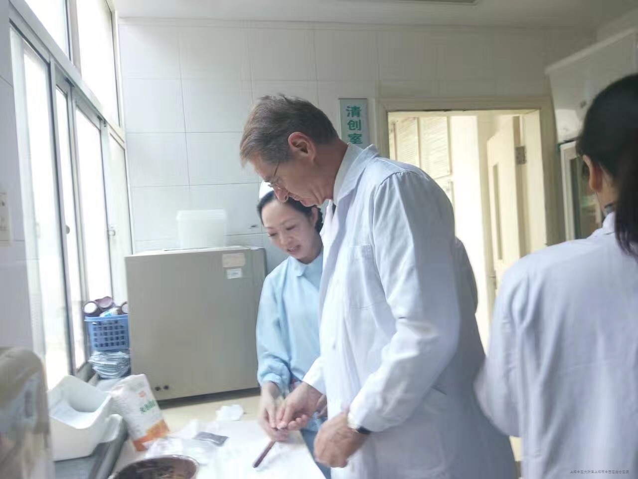 Reinhard Fuenfstueck教授首先参观了脉管科病房,观摩了糖尿病足外用中药的调制及糖尿病足溃疡的换药过程,并与脉管科医护人员讨论了难治性糖尿病足的病例,脉管科的李斌副主任医师全程翻译及陪同;随后一行人来到内分泌科病房,了解了内分泌科糖尿病宣教及中西医结合治疗糖尿病的特色,并与内分泌科吴坚主任探讨了关于“脆性糖尿病及胰岛素过敏”的相关病例;最后与脉管科、内分泌科的医护人员及进修、实习医师一起,在我院12楼会议厅进行了广泛而深入的学术交流。会议由舒志军院长致辞,吴坚主任医师主持,Fuenfstueck教授就“德国糖尿病足病多学科合作治疗”分享了专业相关进展,我院脉管病科赵诚副主任介绍了“奚氏糖尿病足理论体系”,会后诸位专家合影留念,纷纷表示收益良多,Fuenfstueck教授对于中医药治疗糖尿病及糖尿病足表现出浓厚兴趣,并表达了希望今后继续与我院进行学术交流的愿望。